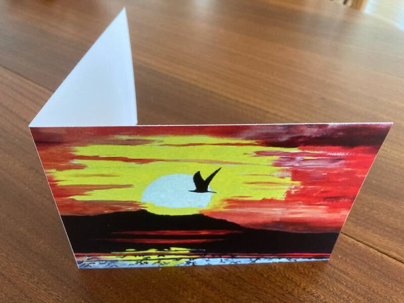 Wenskaart ondergaande zon a (oorspronkelijk schilderij in acryl) Formaat kaart 14,7 x 10 cm.